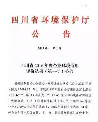 7月21日,四川省環境保護廳發布2017年第1號公告,公布了2016年度第一批企業環境信用評價結果。在全省申報的851家企業中,包括四川東材科技集團股份有限公司在內的29家企業獲得四川省2016年度“環境誠信企業”稱號。 據環保廳政策法規處介紹,“環保誠信企業”的評...